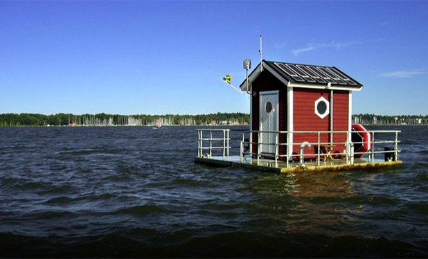 301 meter ut från Amundsgrund i Västerås skärgård guppar en liten röd stuga på en brygga. Hotell Utter Inn ser kanske inte så mycket ut från utsidan, med tre meter under den 25 kvadratmeter stora stugan ligger sovrummet med panoramafönster mot djurlivet under vattnet.